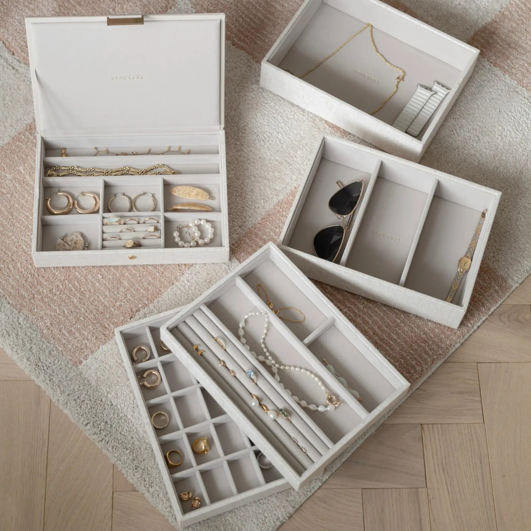 Een juwelendoos moet meegroeien met je collectie. Daarom biedt STACKERS een modulair en stapelbaar systeem, waarmee je jouw sieraden organizer helemaal naar wens kunt samenstellen. Begin met een basislaag en breid uit met extra lagen, deksels of lades. Kies voor een mini juwelendoos, een klassieke juwelendoos of een ruime XL juwelendoos, en voeg later extra compartimenten toe voor ringen, kettingen of horloges. Dankzij dit flexibele ontwerp creëer je een persoonlijke sieradenoplossing die perfect bij je collectie past. Bekijk de collectie laag per laag juwelendozen of ontdek de XL lagen en deksels voor een gepersonaliseerde opbergoplossing.