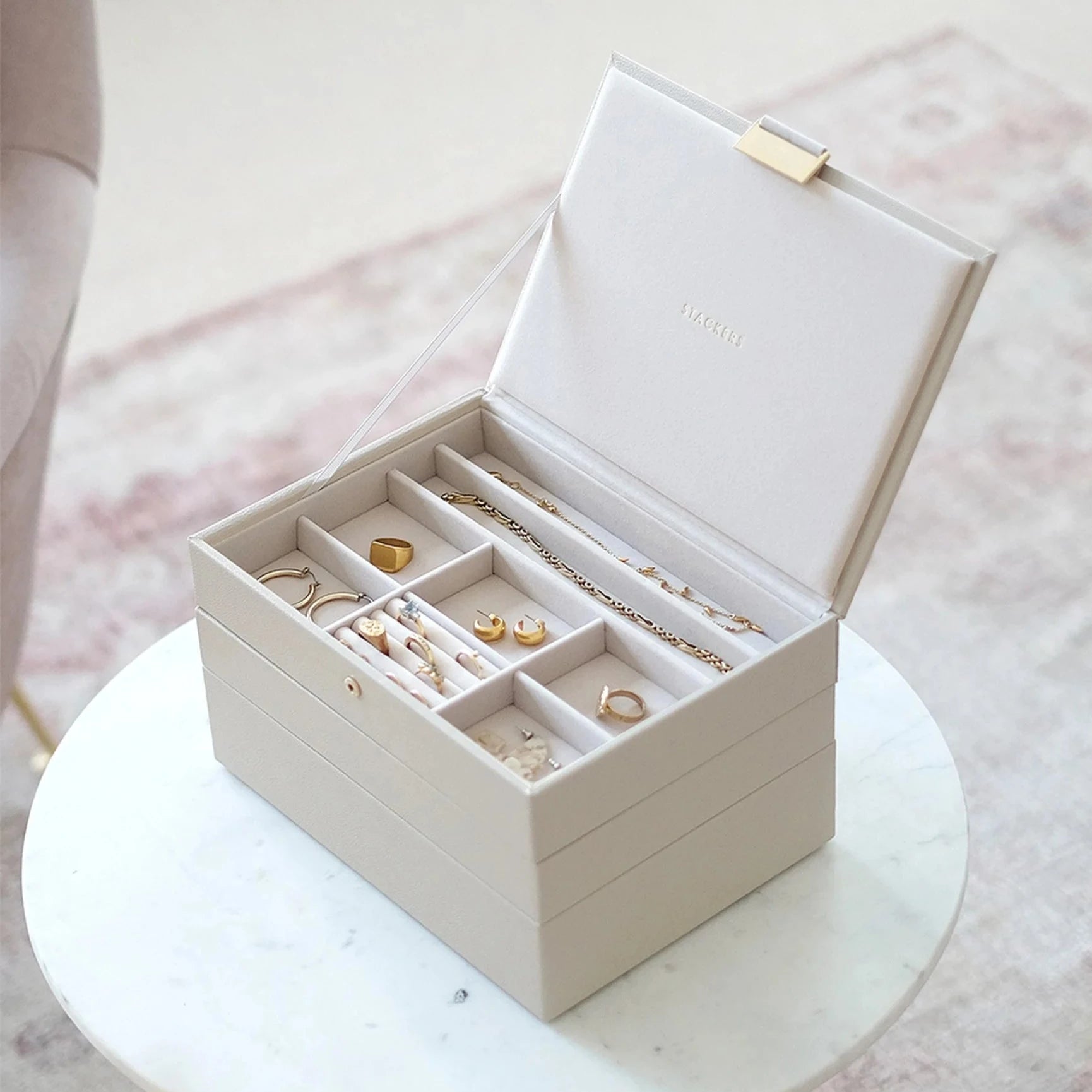 Een juwelenkistje moet niet alleen functioneel zijn, maar ook passen bij jouw interieur. STACKERS biedt sieradendozen in een breed scala aan kleuren, van burgundy en forest green tot taupe en marineblauw. Of je nu kiest voor een klassieke juwelendoos of een moderne display juwelendoos, er is altijd een kleur die bij je past.